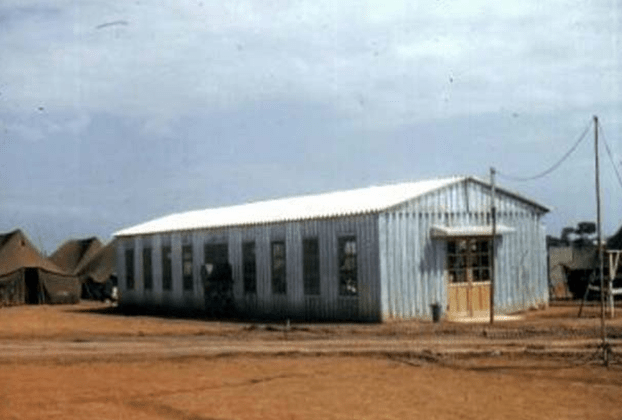 In the late summer or early fall of 1955, better living facilities were provided when several barracks were constructed. The buildings were made of metal walls and roof on a concrete slab for the floor. For heating, each building had one pot-bellied stove in the middle. The average size was about 20′ x 60′.