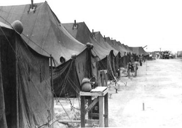 In June of 1955, all personnel were housed in eight man squad tents. The only permanent buildings at the time were the mess hall, the two Operations buildings and the Communications Center. Depending upon the weather, the entire site was either dust or a sea of mud. The latrine was a slit trench over which were wooden seats inside a tent.