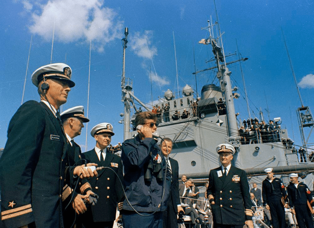 Featured image: During a visit aboard the United States Naval ship USS Observation Island (EAG 154), President John F. Kennedy (center left) watches a demonstration of the firing of a Polaris A-2 missile from the submarine USS Andrew Jackson (SSBN 619), at sea off the coast of Florida. Courtesy John F. Kennedy Presidential Library and Museum