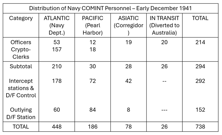 During November and early December of 1941, Japanese diplomatic traffic was diverting 30% of the Navy’s intercept and D/F effort, 12% of its decrypting effort and 50% of its Japanese translation effort from their proper military functions. Loss of the translators hurt us the worst as the total number available was inadequate even for Japanese Naval messages. Loss of decryption personnel was more serious than the numbers indicate because our “first team” in Washington had to be assigned Japanese diplomatic traffic. Detailed breakdowns are given in tabular form following: