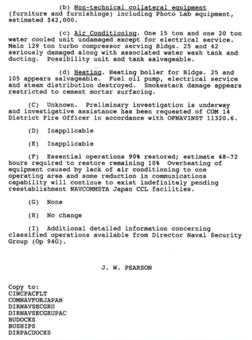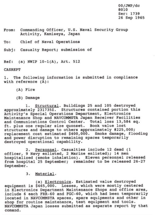 24 September 1965 – Security Communications Facility, 11 enlisted men, 1 officer died – $1,307,800 property loss. At 0235, smoke was noted in operations area by watchstander. A search for the source of the fire revealed fire in combustible undivided 1st floor concealed space. Smoke quickly spread as Fire Department was called and occupants attempted to fight the fire. Two 500-gpm pumpers responded manned by military and Japanese Nationals. Realizing the seriousness of the fire outside aid was called.