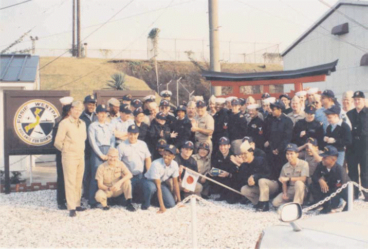 With the impending closure of the Naval Security Group Activity Kamiseya, a question was raised as to what to do with the torii/plaque. The decision was made to send the plaque to the NSG Headquarters museum at the Security Station, Nebraska Ave. Washington, DC (now at Fort George G. Meade, Maryland). Also, it was decided to give the torii to the Detachment at Yokosuka – which officially became an activity coincident with the stand down of Kami Seya. Another working party was formed, this time it included: CTM2 William A. Kerstiens, CTO3 Rickey L. Winfield, CTO3 Daniel M. Fair and CTOSA Timothy M. Harrison along with several Public Works personnel operating a hoist. The plaque was removed and boxed for shipment to the States. On the afternoon of 28 April 1995 the torii came down and was taken to the Public Works Department to await transportation to Yokosuka. The torii was trucked to Yokosuka on 30 May. The Detachment designed a new logo and included a torii (for the first time) in their new design. This will be a fitting way to keep alive the memory of Kami Seya and those who served there.