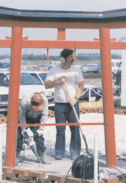 The expanded memorial area was started 21 October 1991. The project took until 15 November to complete. Cost savings, as a self help vs contracted project was $8000. Now that the area was completed, it was time to move the Torii.