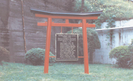 Featured image: 1981 photograph showing the memorial plaque hanging in the original wooden torii. The location has became known as the “Torii Memorial Area” and is adjacent to the “tunnel” (seen as the back drop) and the tunnel entrance. Note the bike shed to the right.
