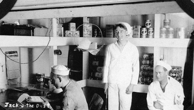 In another holdover from the Royal Navy, the sailor who assisted the cook by breaking out provisions was known as Dusty, or Jack of the Dust, because he was often covered in flour from working in a bread room. The rating was established in the U.S. Navy in 1876 and referred to the storeroom keeper. Jack of the dust ceased being an official rating in 1893, but the name lives on in the modern Navy as an informal title given to the culinary specialist in charge of canned goods or the sailors assigned to food-service duty.