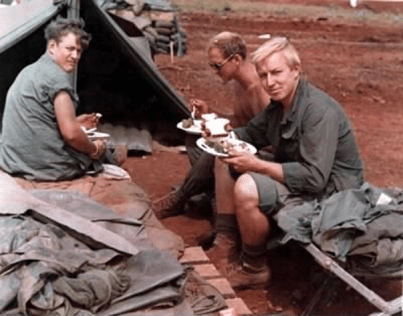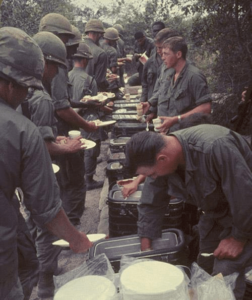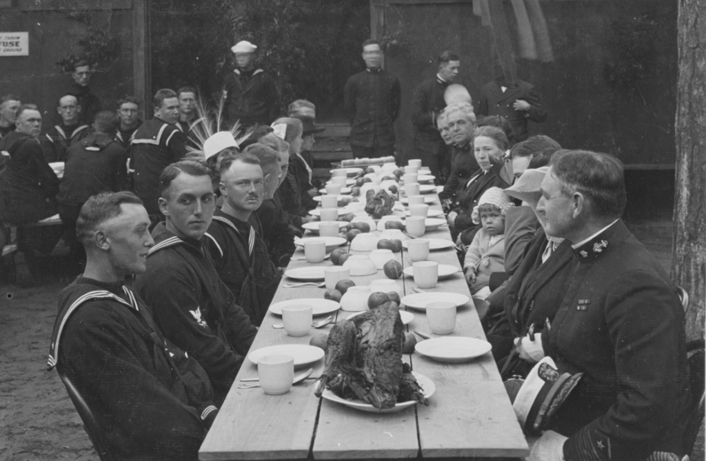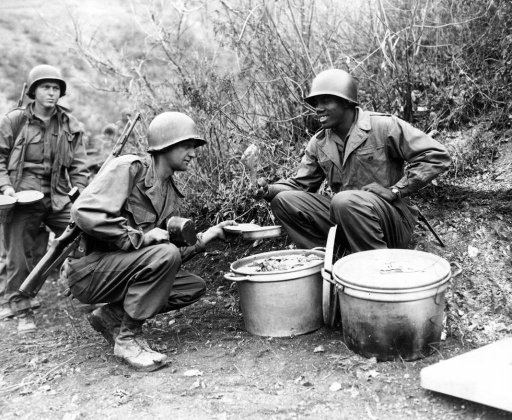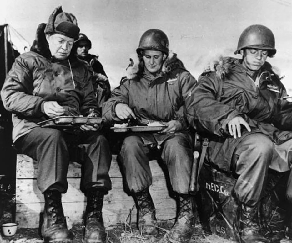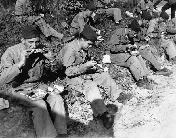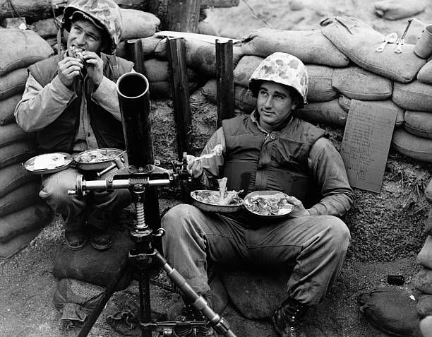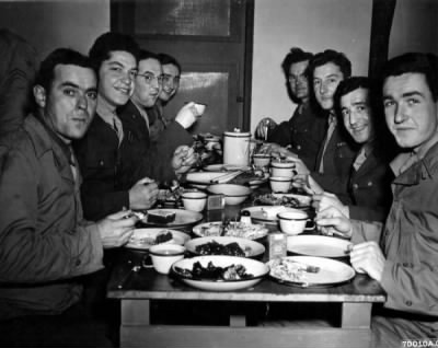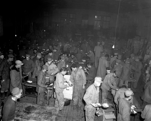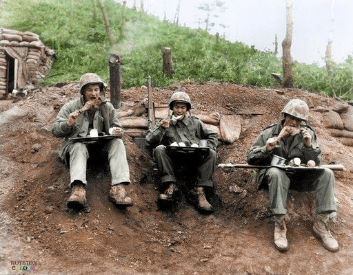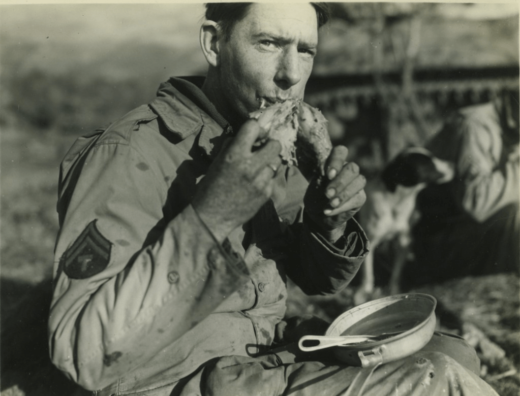North Korea, 5th Marine Regiment has Thanksgiving dinner of turkey, pumpkin pie, and trimmings. 22 November 1950