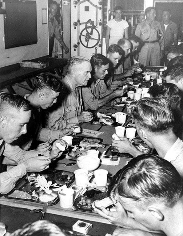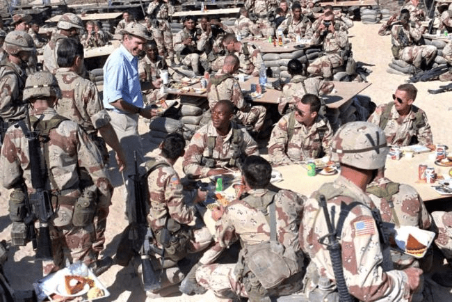 In 2010 Gen. David Petraeus, CENTCOM commander, served turkey to sailors (including Petty Officer Third Class Albrian Crisotomo) while visiting the USS Nimitz (CVN 68) underway in the Persian Gulf.