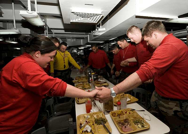 Sailors give thanks before enjoying their Thanksgiving meal aboard the aircraft carrier USS George Washington (CVN 73)