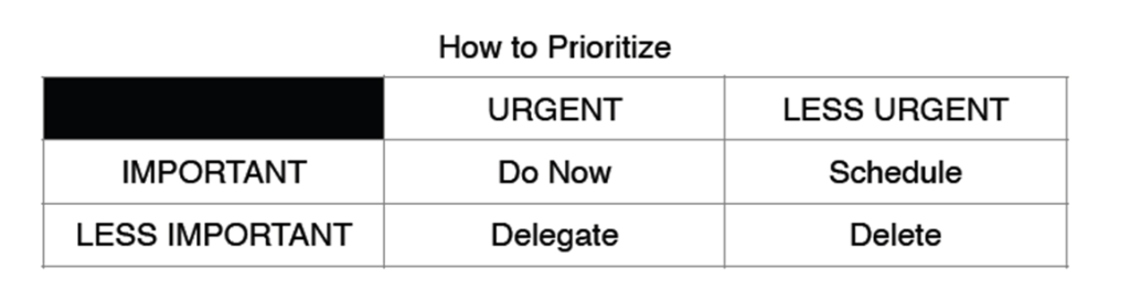 You must know the difference between urgent and important. You must learn what to delegate, what to task, and when you should take a direct interest in an action. I borrowed this graph from Dwight D. Eisenhower and I think it is one of the simplest and best tools for how to approach prioritization.