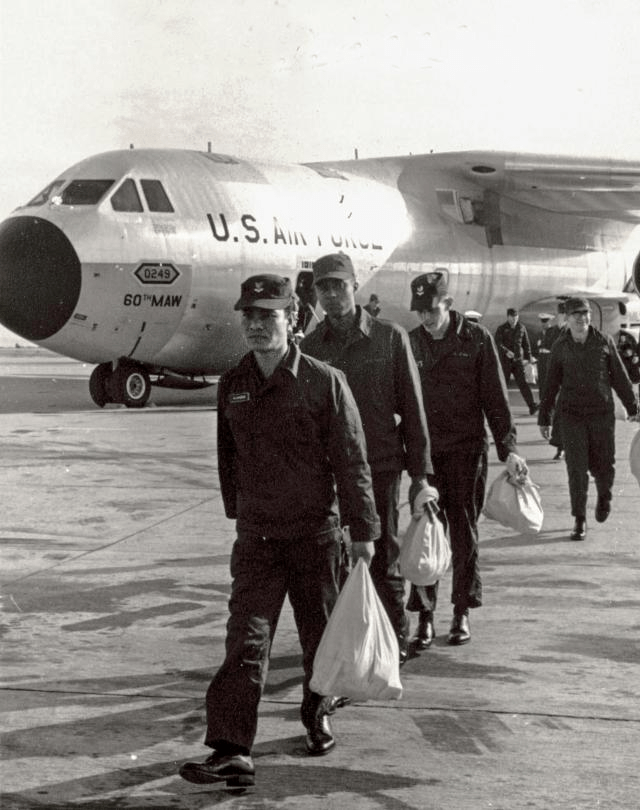 In San Diego, two black dots appeared on the horizon, getting bigger by the moment. “They’re coming in!” someone shouted. The C-141 Starlifters circled the airfield and seemed to land in slow motion. The big jets taxied toward the waiting families and cut their engines. A tense stillness settled over the crowd as uniformed sailors unrolled red carpets up to the aircraft. Then a hatch on the lead plane popped open, and Pet Pucher wobbled down the staircase, worn-looking but smiling.