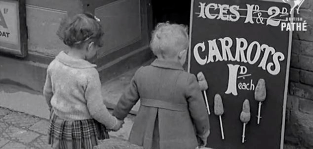 That same year, the British Ministry of Food launched a Dig For Victory Campaign which introduced the cartoons ”Dr. Carrot” and “Potato Pete”, to get people to eat more of the vegetables (bread and vegetables were never on the ration during the war). Advertisements encouraged families to start “Victory Gardens” and to try new recipes using surplus foods as substitutes for those less available. Carrots were promoted as a sweetener in desserts in the absence of sugar, which was rationed to eight ounces per adult per week. The Ministry’s “War Cookery Leaflet 4″ was filled with recipes for carrot pudding, carrot cake, carrot marmalade and carrot flan. Concoctions like “Carrolade” made from rutabagas and carrots emerged from other similar sources.