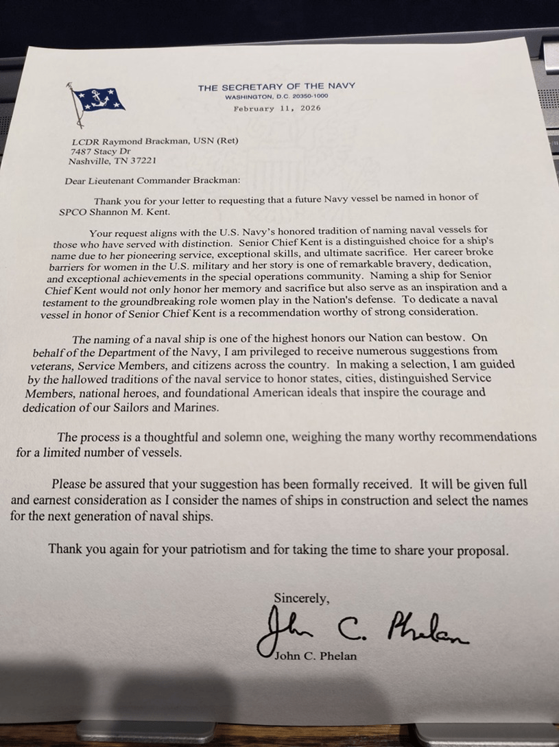 Letters are now arriving from the Honorable John C. Phelan, Secretary of the Navy, regarding the naming of a ship after Senior Chief Kent. According to the SECNAV, “Please be assured that your suggestion has been formally received. It will be given full and earnest consideration as I consider the names of ships in construction and select the names for the next generation of naval ships.”